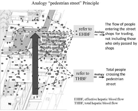 一条步行街有很多商铺,经过步行街的所有客流量可以比作全肝血流,走进各店铺完成购物的顾客可以比作有效肝血流,有过门而不入的顾客比作无效肝血流,有效肝血流≈全肝血流-无效肝血流。如下图[9]: